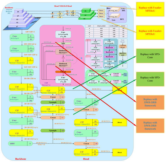 Improved implementation process of the baseline YOLOv8 architecture and three optimization components.