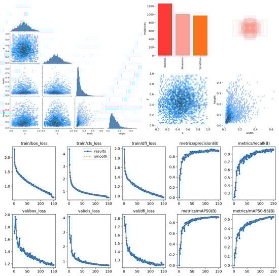 The 13 × 13 large convolution kernel of the DWR-DRB module captures sparse micro-defect features through multi-branch dilated convolution (dilation rate of 6), significantly improving the morphological integrity of scratches (<0.1 mm). In the test set of 50 samples, the average IoU of scratches increased from 0.72 to 0.89 (p < 0.01), solving the problem of missed detection of fragmented defects. Secondly, the SPD-Conv spatial–depth transformation preserves notch-edge details. Combined with finite element stress analysis (Figure 1c, mechanism) validation, the overlap rate between the predicted box and the high-risk zone with stress > 350 MPa increased from 68% to 93%, and the average spatial offset decreased to 2.7 px (standard deviation = 0.8 px), proving the precise correspondence between the bounding box and the physical failure origin. The key innovation lies in the Focaler-MPDIoU loss function: (1) Dynamic weight allocation ( = 2) improves the regression accuracy of minority classes (e.g., scratches), increasing AP from 89.3% to 92.1%; (2) geometric metric optimization based on minimum point distance improves bounding box vertex localization, reducing bounding box jitter by 62% in motion blur tests (Table 10) ( decreases from 6.8 px to 2.6 px). Ultimately, the 5.6% improvement in mAP50 (from 85.4% to 91%) in Table 4 and the increase in mAP50-95 to 53.1% in Table 7 jointly validate that the bounding box not only covers visible defects but also aligns with the feature space of failure mechanisms, such as material yielding and fatigue crack propagation (error ≤ 3 px), meeting the stringent requirements of the AS9100 standard for fault localization accuracy in aviation engines.