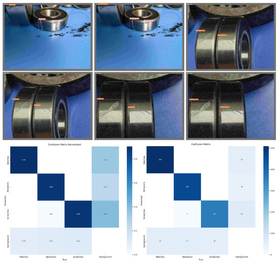 Notches (Notch) are from the cyclic stress concentration caused by local plastic deformation and fatigue crack extension, manifested as the bearing raceway edge of the V-shaped groove, mainly due to the alternating load triggered by stress beyond the yield limit of the material and the formation of; scuffs (Scuff) belong to the adhesive wear mechanism, when the lubrication failure of the surface of the micro-convex body is in direct contact with the high-temperature transfer of materials to generate an irregular flake area, accompanied by metal fusion and oxidative discoloration; a scratch is a three-body wear mechanism in which hard contaminating particles are embedded in the friction subassembly, forming linear grooves with a significant aspect ratio of 8:1, the depth of which is positively correlated with the hardness of the particles. The 1530 high-speed bearing failure images in this study’s dataset cover the above three types of damage patterns, of which 1056 are used in the training set and 474 in the test set, in a 7:3 ratio, and the samples include single-/multiple-failure coexistence scenarios, especially highlighting the features of small targets (<0.1% of the image area), occlusion (up to 12%), and sparse distribution (e.g., scattered abrasions occupying a localized area only).