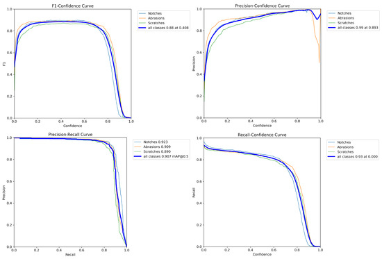 First, at the level of theoretical innovation, the DWR-DRB module effectively addresses the insufficient sensitivity of traditional convolutional neural networks in extracting features from tiny defects. By combining a dynamic weight allocation mechanism with a depthwise-separable residual structure, it enables adaptive feature weighting that improves the model’s recall for low-contrast defects such as notches, reaching up to 81.0%, which is 3% higher than that of traditional methods. The SPD-Conv module introduces a novel spatial pyramid depth-separable convolution structure that enables lossless retention of multi-scale features. This significantly enhances the detection of complex texture patterns such as abrasions, achieving an mAP50 of 87.9%. The Focaler-MPDIoU loss function combines a focus modulation mechanism with an improved distance-aware intersection-over-union strategy. This fusion effectively addresses both class imbalance and localization inaccuracies in small-target detection, resulting in an mAP50-95 of 47.9%, which is 2–3 percentage points higher than that achieved using traditional IoU-based loss functions.