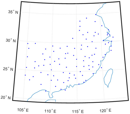 In this paper, we study the temperature prediction problem in 100 cities in southern China [33]. The cities are shown in Figure 1 based on their latitudes and longitudes. We aimed to predict the temperature of one city based on a short period of its historical data and the relationships between the temperatures of its neighboring cities. Daily maximum temperatures over a period of 365 days from 1 January 2018 to 31 December 2018 of these 100 cities were collected from [34].