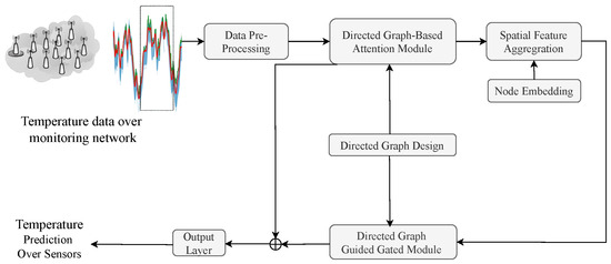 Although relationships between sensors have been studied for temperature prediction using graph networks, they are often characterized by graph embedding or graph encoders. Therefore, these relationships remain unclear. In this study, we aimed to develop an explicit graph adjacency matrix that considers the relationships between sensors based on their locations. Note that the impacts between sensors can be directional. For example, in a cold snap, neighboring areas with low temperatures can affect areas with high temperatures, causing the high-temperature areas to cool down. Therefore, a graph adjacency matrix was designed as a directed graph in order to present the directional relationships between sensors. Then, a directed-graph-based attention module was designed to extract the spatial relationships between temperature data over different sensors; the temporal relationships pertaining to the temperature data were extracted using a graph-gating module. Thereafter, the temperature around the sensors could be predicted based on the fusion of the directed-graph-based spatial–temporal features of the temperature data. The contributions of this manuscript are summarized as follows: