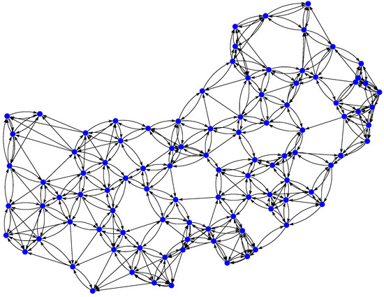 In this section, the proposed physics-informed directed-graph-based temperature prediction model is illustrated based on a real-world temperature dataset collected in 100 cities of China [33,34]. Daily temperatures over a period of 365 days were studied, where 100 days of temperature data were used for training, 85 days of data were used for validation, and 180 days of data were used for testing. The directed adjacency matrix was computed using Equation (6), where the distance between two temperature-monitoring stations is computed based on their latitudes and longitudes and the coefficient . Each station chooses the five closest stations to construct a directed adjacency matrix . The directed graph is shown in Figure 3. A directed edge between two cities indicates that the temperature of the arc-tail city is considered in forecasting the temperature of the arc-head city. However, the temperature of the head city does not take into account the prediction of temperature of the tail city. If there is no directed edge between two cities, the temperature relationships between these two cities are not considered when forecasting the temperature. The configuration of the experimental parameters is summarized in Table 1.