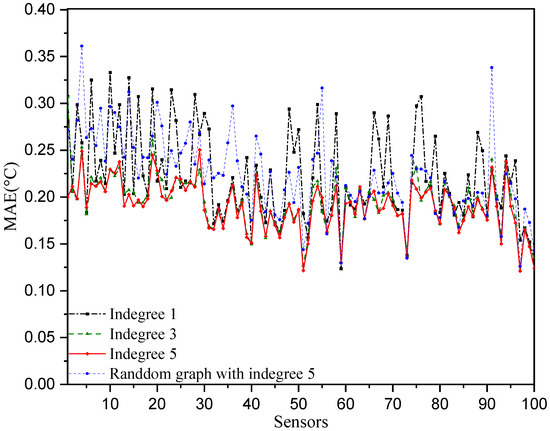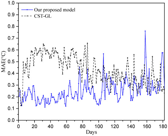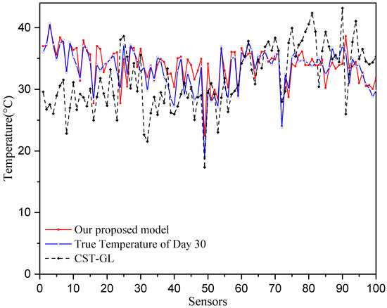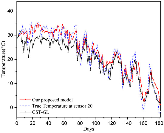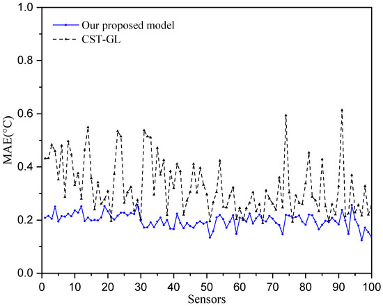 where . The mean absolute errors of each sensor are shown in Figure 5, where we can see that all of the mean temperature prediction error are smaller than 0.25 °C, while most of the MAE of the CST-GL model are greater than 0.3 °C. This demonstrates the superior prediction performance of the proposed model.