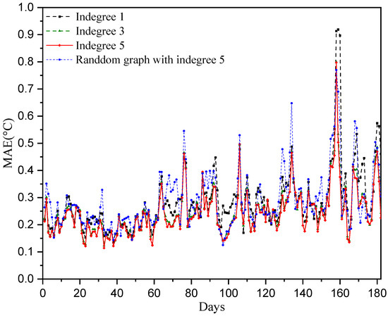 In the aforementioned numerical experiments, each station selects its five closest neighboring stations for temperature prediction. Hence, the in-degree of each node of the constructed directed graph adjacency matrix is five. To investigate the influence of the directed adjacency matrix on the temperature prediction performance, the adjacency matrices of in-degree 1 and 3 are considered. That is, each station selects the closest one (or the closest three) neighboring stations for temperature prediction. The results are shown in Figure 8 and Figure 9. We can observe that the directed adjacency matrix with in-degree of 5 has the best temperature prediction performance across the sensors as well as over the 180 test days. The performance is significantly degraded when only the closest station is selected in the temperature prediction. Furthermore, we consider a random adjacency matrix with an in-degree of five in the prediction model. That is, each station randomly selects five other stations for temperature prediction. Its performance is worse than the case of the adjacency matrix with the closest five neighboring stations. The reason for this may be that the relationships regarding temperature at randomly selected stations are not as strong as those at the five closest neighboring stations.