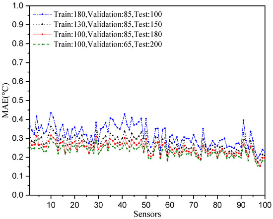The temperature prediction performances with different data length configurations are shown in Figure 10. We can observe that both the number of train data and test data cannot be too small. A small number of training data cannot provide enough data with which to learn the relationships between the temperatures, and a greater number of test data will make the mean absolute error of prediction performance more robust.