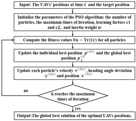 When the iteration reaches the maximum number, the iteration stops and outputs the optimal solution; thus, the optimal UAV positions for the next time step can be obtained. The flowchart of the PSO algorithm is shown as follows, see Figure 1.