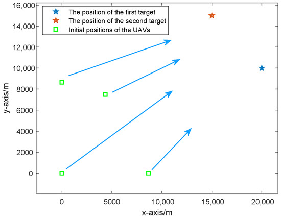 Consider that there are four UAVs and two stationary targets in a two-dimensional plane. The initial coordinates of the UAVs are [0, 0] m, [8660, 0] m, [4330, 7500] m, and [0, 8660] m, and the targets are located at [20,000, 10,000] m and [15,000, 15,000] m. The initial topology of the UAVs and the targets is given in Figure 2, where the green squares represent the initial positions of the UAVs, the blue and red five-pointed stars indicate the two target positions, and the blue arrows indicate the moving directions of the UAVs.