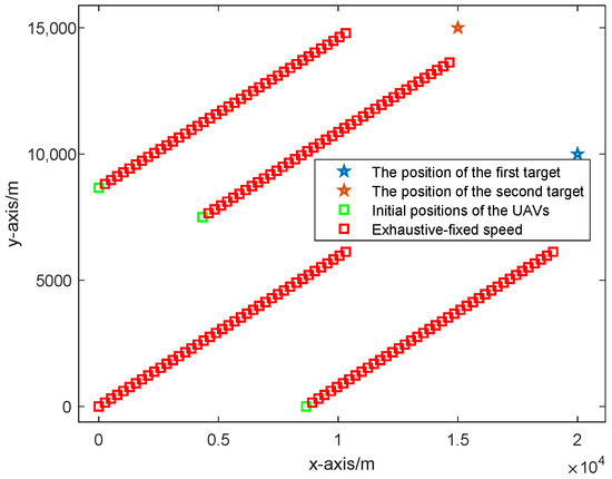 From Figure 5, the simulation results of the RMSE and CRLB between different UAV path optimization algorithms in the dual-target scenario are shown and compared, including the fixed formation, the exhaustive algorithm considering UAVs with fixed speed, and the exhaustive algorithm considering UAVs with variable speed. (a) presents the comparison between the RMSE and CRLB for the target located at [20,000, 10,000] m, while (b) shows the comparison between the RMSE and CRLB for the target located at [15,000, 15,000] m. From the results, we can see that for the target located at [20,000, 10,000] m, the RMSE of the UAVs with fixed formation converges to 12.23 m and the CRLB converges to 0.90 m. The RMSE of the UAV path optimized based on the exhaustive algorithm considering the UAVs with fixed speed converges to 14.47 m and the CRLB converges to 0.89 m. The RMSE of the UAV path optimized based on the exhaustive algorithm considering the UAVs with variable speed converges to 9.85 m and the CRLB converges to 0.41 m. For the target located at [15,000, 15,000] m, the RMSE of the UAVs with fixed formation converges to 11.65 m and the CRLB converges to 0.47 m. The RMSE of the UAV path optimized based on the exhaustive algorithm considering the UAVs with fixed speed converges to 15.21 m and the CRLB converges to 0.98 m. The RMSE of the UAV path optimized based on the exhaustive algorithm considering the UAVs with variable speed converges to 9.65 m and the CRLB converges to 0.40 m. Thus, compared to the UAVs with fixed formation, the UAV path optimized based on the exhaustive algorithm considering the UAVs with variable speed reduces the average RMSE of the two targets by about 18.35% and reduces the average CRLB by about 50.16%. Then, compared to the UAV path optimized based on the exhaustive algorithm considering the UAVs with fixed speed, the UAV path optimized based on the exhaustive algorithm considering the UAVs with variable speed reduces the average RMSE by about 34.27% and reduces the average CRLB by about 56.62%. The results indicate that by considering the UAVs with variable speed, the UAV path optimization algorithm could significantly improve the target localization accuracy in the dual-target scenario.