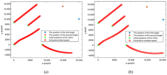 UAV paths optimized by the exhaustive algorithm. (a) UAV path optimized considering the UAVs to have a fixed speed. (b) UAV path optimized considering the UAVs to have variable speed.