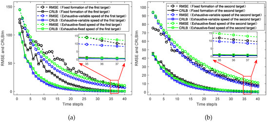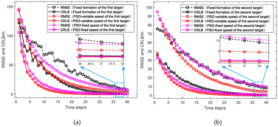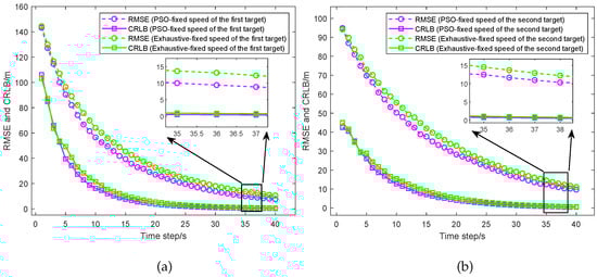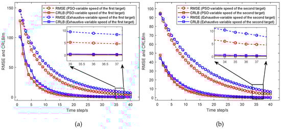 The situation where the UAVs are considered with variable speed is almost the same as the situation where the UAVs are considered with fixed speed. As shown in Figure 9a, the RMSE for the UAV path optimized by the PSO algorithm converges to 5.54 m and the CRLB converges to 0.13 m. The RMSE for the UAV path optimized by the exhaustive algorithm converges to 9.85 m and the CRLB converges to 0.41 m. As shown in Figure 9b, the RMSE for the UAV path optimized by the PSO algorithm converges to 5.62 m and the CRLB converges to 0.13 m. The RMSE for the UAV path optimized by the exhaustive algorithm converges to 9.65 m and the CRLB converges to 0.40 m. Thus, the RMSE and the CRLB obtained by the PSO algorithm are significantly lower than those obtained by the exhaustive algorithm. Compared to the UAV path optimized based on the exhaustive algorithm, the UAV path optimized based on the PSO algorithm considering the UAVs with variable speed reduces the average RMSE of the two targets by about 42.76% and reduces the average CRLB by about 67.58%. The results indicate that according to the PSO algorithm, the UAV path optimization algorithm could significantly improve the target localization accuracy in the dual-target scenario.