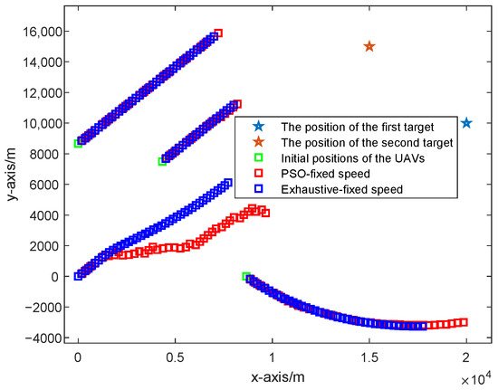 As can be seen from Figure 6, the UAV paths optimized based on the PSO algorithm and the exhaustive algorithm considering the UAVs with fixed speed are shown and compared, where the red squares represent the UAV path optimized based on the PSO algorithm, and the blue squares represent the UAV path optimized based on the exhaustive algorithm. Obviously, the UAV paths optimized based on the PSO algorithm and the exhaustive algorithm considering the UAVs with fixed speed are almost the same because they are both optimized based on the CRLB criterion but by different optimization algorithms.