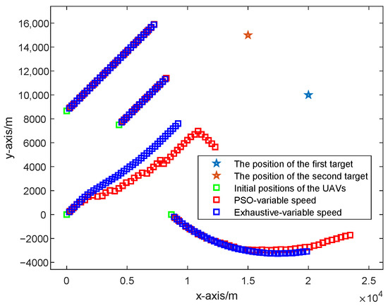 In this section, numerical simulations are performed to verify the validity and effectiveness of the proposals in this paper. Firstly, the basic parameters and the initial topology of the UAVs and the target are given. Secondly, five methods are presented and compared to verify the advantages of the proposed method in this paper, and the five methods include the following: (1) the PSO algorithm considering the UAVs to have variable speed; (2) the PSO algorithm considering the UAVs to have a fixed speed; (3) the exhaustive algorithm considering the UAVs to have variable speed; (4) the exhaustive algorithm considering the UAVs to have a fixed speed; (5) the algorithm considering the UAVs to have a fixed formation.