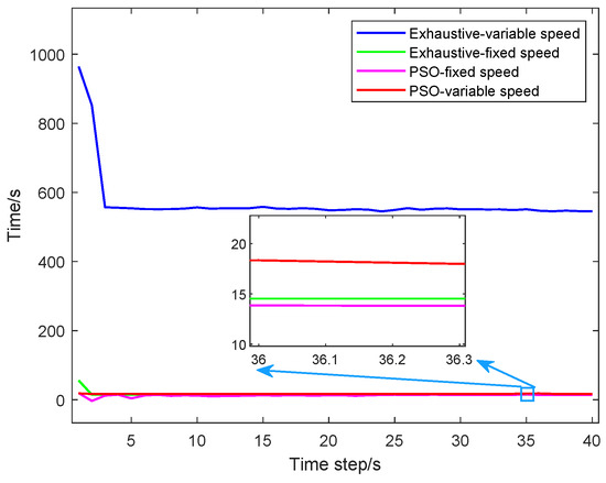 To verify the effectiveness of the PSO algorithm, we compare the average computation time per time step for different UAV path optimization algorithms. From Figure 11, we can see that 17.50 s is needed for the exhaustive algorithm considering the UAVs with fixed speed, 656.44 s is needed for the exhaustive algorithm considering the UAVs with variable speed, 17.04 s is needed for the PSO algorithm considering the UAVs with fixed speed, and 20.96 s for the PSO algorithm considering the UAVs with variable speed. Thus, the computational efficiency of the PSO algorithm considering the UAVs with variable speed reduces by about 96.81% compared to the exhaustive algorithm considering the UAVs with variable speed. However, the computation time for the PSO algorithm considering the UAVs with variable speed is slightly higher than that for the PSO algorithm considering the UAVs with fixed speed and the exhaustive algorithm considering the UAVs with fixed speed. The localization accuracy of the former algorithm is better than that of the latter algorithms. Thus, from the numerical simulation results, it is illustrated that the proposed method in this paper could achieve better localization accuracy with proper algorithm efficiency.