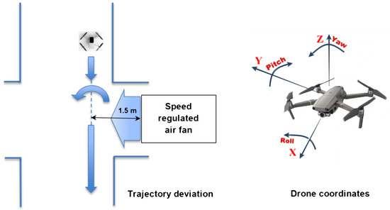 Before each experiment, the airflow velocity generated by the fan was measured using a manual anemometer in the corridor, at the UAV flight trajectory (about 1.5 m from the fan; see Figure 9). The airflow velocity values obtained this way were (1) 1.13, (2) 1.34, (3) 1.62, (4) 1.78, and (5) 2.40 m/s. The trajectory of the drone flying into the side airflow generated by the fan was disturbed and deviated, which was recorded by both internal and external IMU sensors.