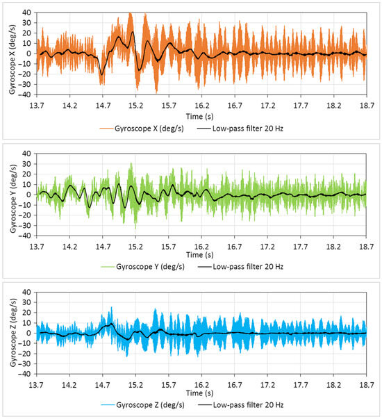 The original signal from a gyroscope is recorded with a sampling frequency of 400 Hz. Preliminary resampling is also implemented for the original signals since the sampling rate deviated in the 0.000–0.005 s range with a mean value of 0.0025. In parallel to raw data, the low-pass (20 Hz) filtered transient signals are shown in Figure 11.