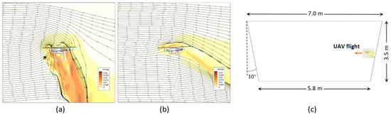 Velocity field perturbations and steady streamlines around a drone flying at (a) 2 m/s and (b) 5 m/s forward velocity [48]; (c) the nominal geometry of the tunnel section and scaled size of the drone with disturbed surrounding area for 5 m/s velocity.