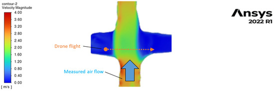 The demonstration by CFD simulation of the measurement method is represented in Figure 15, where the drone flies in one tunnel with weak flow (below 0.3 m/s) and measures the air velocity in another tunnel at the place of their crossing. In this case, the deviation of the drone trajectory will be to the left side since the air velocity will be higher on the right side.
