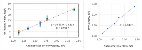 where —airflow velocity (m/s), —maximum drone rotation speed around X (roll) axis (rad/s), k—coefficient of airflow in the drone flying tunnel (equal to 16.533 in our measurements), and a—bias of linear function (equal to −14.213 in our measurements). The extreme values of the drone rotation speed are calculated by the function if the disturbance acts from the left side (clockwise drone deviation) and the function if the disturbance is from the right side (counterclockwise deviation).