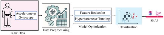 In this research work, we have utilized the KU-HAR dataset. Next, we have applied a feature extraction technique based on mathematical expressions as part of the data preprocessing stage. Subsequently, we have deployed two proposed models: XGB optimized with the GJO algorithm (GJO-XGB) and XGB optimized with the WARSO algorithm (WARSO-XGB). Finally, we have performed an in-depth interpretability analysis of the models using SHAP, as illustrated in Figure 1.