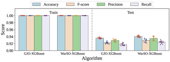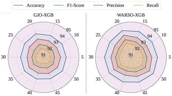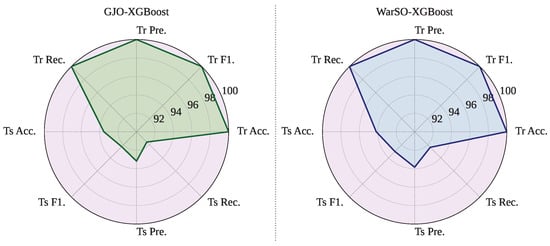 Classification using XGB and the finalized features and hyperparameters from GJO has been defined as GJO-XGB, while XGB with WARSO has been defined as WARSO-XGB. Table 10 presents the fold-wise performance across the 10 folds. Both models have demonstrated a perfect performance on the training data across all folds, consistently achieving 100% accuracy, F-scores, precision, and recall. This indicates that the models have fully fit the training sets, highlighting the effectiveness of the selected features and hyperparameters in modeling the training patterns. In the testing phase, WARSO-XGB exhibited a slightly better performance than that of GJO-XGB in most folds. The test accuracy for WARSO-XGB ranges from 93.65% to 94.47%, whereas GJO-XGB’s accuracy varies from 93.35% to 93.93%. Additionally, WARSO-XGB has consistently shown higher F-score, precision, and recall values across several folds, suggesting improved predictive reliability on unseen data.
