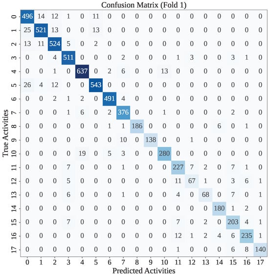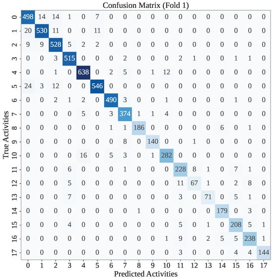 Figure 4 presents the confusion matrix for the first fold of the WARSO-XGB framework. As shown in the figure, WARSO-XGB has achieved a high classification accuracy for most activity classes, with strong diagonal dominance in the matrix. For instance, out of 507 instances of activity 0, the model has correctly classified 498, while the rest were misclassified into similar classes, such as 1, 2, and 3. Similarly, classes 4, 5, and 2 have high correct classification counts of 638, 546, and 528, respectively, indicating that the model effectively distinguishes these activities. But WARSO has correctly classified 5860 records out of 6225 in the first fold test set.