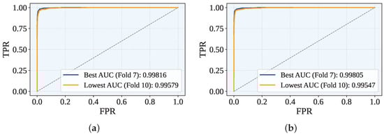 Figure 6 displays the Receiver Operating Characteristic (ROC) curves for the best- and worst-performing folds, where the ROC curve visualizes the trade-off between the true positive rate (TPR) and the false positive rate (FPR) across classification thresholds. The AUC metric, which quantifies the overall discriminative ability (with 1.0 indicating perfect separation), reached peak values at fold 7 for both proposed frameworks (GJO-XGB: 0.99816; WARSO-XGB: 0.99805). The weakest performance occurred at fold 10 (GJO-XGB: 0.99579; WARSO-XGB: 0.99547). As summarized in Table 13, the mean AUC across all folds was marginally higher for GJO-XGB (0.99709) than WARSO-XGB (0.99699).