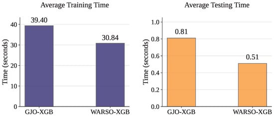 Once the models have been optimized, they do not require any further optimization. Therefore, the time complexity was analyzed solely for the training and testing phases. Table 15 and Figure 8 present the training and testing times for each fold, along with the corresponding mean values. GJO-XGB recorded a mean training time of 39.40 s while handling 14,525 records and 23 features. In contrast, WARSO-XGB required only 30.84 s on average to train the models, despite using the same number of records with a larger feature set of 44. Moreover, WARSO-XGB consistently demonstrated lower testing times, achieving a mean of just 0.51 s, outperforming GJO-XGB in both aspects of execution time.