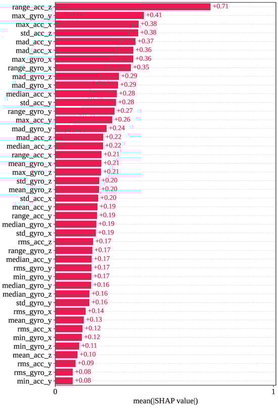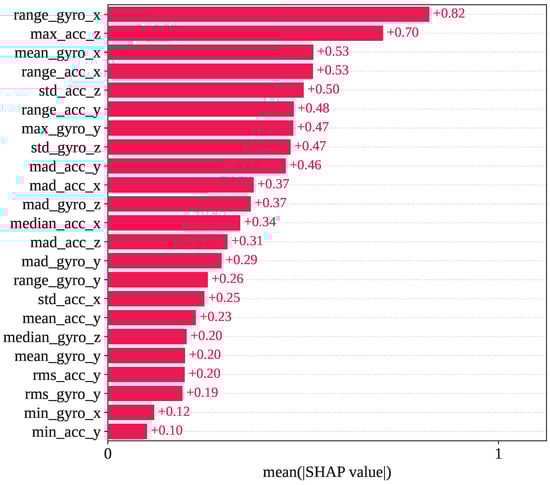 Figure 9 presents the mean SHAP value for the GJO-XGB framework. In test fold set 1, range_gyro_x has been recognized as the most impacted feature, with a mean SHAP value of +0.82. max_acc_z, mean_gyro_x, range_acc_x, and std_acc_z are the subsequent most influential features identified by SHAP, having mean SHAP values of +0.70, +0.53, +0.53, and +0.50, respectively.