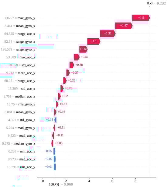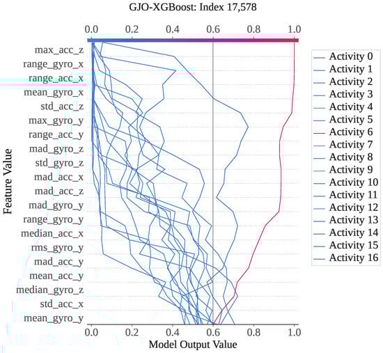 For index 17,578, the sample belongs to activity class 6 (lay–stand), and the model correctly predicted it as class 6. As shown in Figure 11, activity 6 has the highest SHAP output value of approximately 1. The decision plot indicates that the SHAP values for all classes vary between 0 and 1, with activity 6 standing out prominently. This confirms that this instance is strongly associated with class 6, and therefore, GJO-XGB has accurately classified it. For a deeper analysis of this particular prediction, we have presented the waterfall plot for activity class 6. Figure 12 illustrates how each feature contributes to the final prediction, with the SHAP values indicating their influence in pushing the model output toward class 6. The feature max_gyro_y (136.57) has contributed the highest SHAP value of , followed by mean_gyro_x (), range_acc_x (), range_gyro_x (), and range_gyro_y (), among others. Collectively, these feature contributions have shifted the base value of the model output, , to a final SHAP output of , which is higher than 0.5, thereby supporting correct classification of the instance as activity 6.