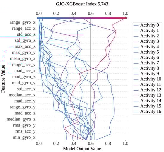 However, Figure 10 shows the mean SHAP values calculated using SHAP for the WARSO-XGB framework. In WARSO-XGB, range_acc_z, max_gyro_y, max_acc_x, std_acc_z, and mad_acc_y are the top five most important features, which have mean SHAP values of +0.71, +0.41, +0.38, +0.38, and +0.37, respectively. We also analyzed individual predictions from the fold 1 test set, a correct prediction, and a wrong prediction, through the SHAP decision plot. The first sample in the fold 1 test set has an index of 17,578, and the first misclassified index is 5743. These two indices showed the same type of classification in both GJO-XGB and WARSO-XGB: index: 17,578, correct classification (actual activity: 6); index: 5743, wrong classification (actual activity: 12; predicted activity: 13).