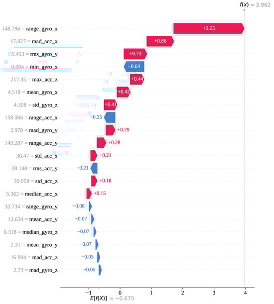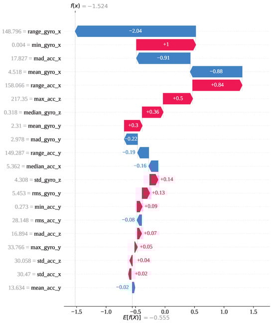 Figure 15 presents the waterfall plot for the same index (5,743) from the perspective of activity 13 to understand the underlying reasons behind the model’s misclassification. The feature range_gyro_x has been identified as the most influential contributor, with a SHAP value of , followed by mad_acc_x (), mean_gyro_x (), max_acc_z (), and a few other features with positive SHAP values. Collectively, these contributions have shifted the base value to a final SHAP output of for activity 13, while the output SHAP value for activity 12 is . As a result, the model favored activity 13, leading to an incorrect classification. So, index 5743 has been mainly misclassified due to the impact of the features range_gyro_x, mad_acc_x, and mean_gyro_x.
