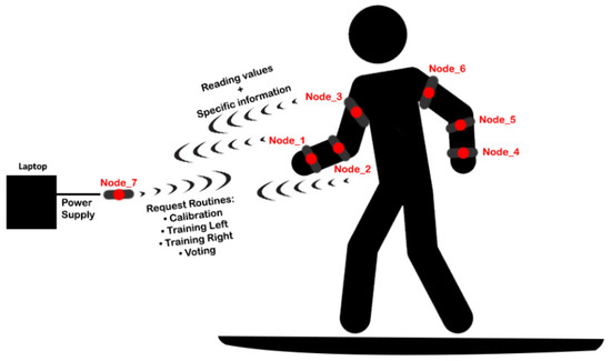 Figure 1 illustrates the hardware configuration, including the mounting of sensor nodes on both arms of the user.