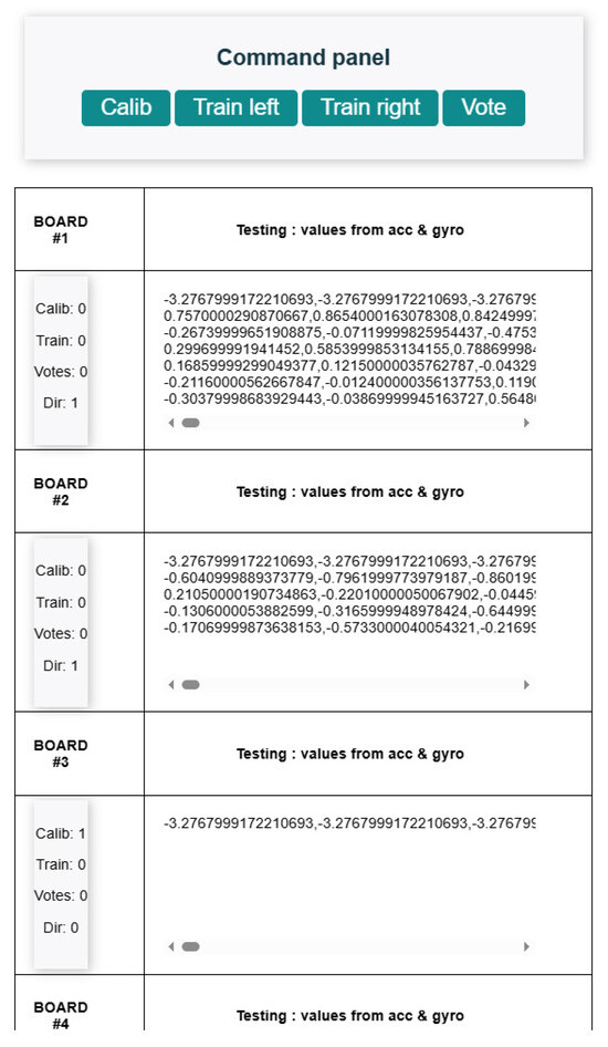 Figure 3 illustrates the command panel and data visualization interface. Key improvements include the separation of training into two distinct phases—left and right stroke acquisition—and the addition of a ‘Dir’ field to indicate the detected direction of paddle movement. Furthermore, three additional data display panels have been incorporated, enabling the simultaneous monitoring of all six sensor nodes.