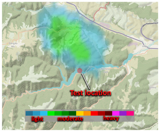 The test environment was located in Cluj County, România, at Lake Tarnița. The meteorological conditions were favorable, with almost no wind and only a brief 10 min rain event, after which clouds moved away from the area and the lake remained calm. Figure 4 presents an image from the National Meteorology Association of Romania [22], illustrating the moment when the light rainfall passed over the test location at Lake Tarnița.