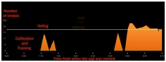 In addition to the proposed system, a Garmin smartwatch was utilized to track the path on the lake. The smartwatch’s SUP application was used to collect various data after the session, including GPS track, stroke count, heart rate monitoring, distance, and air temperature. To ensure consistent data acquisition and allow the observer stationed on the lakeshore sufficient time to visually monitor, count, and interpret each stroke, the paddle strokes were deliberately performed at a slower pace. However, under these conditions, the smartwatch results were inconclusive. As illustrated in Figure 6, generated with the Garmin mobile application, while the stroke-counting routine (voting) was initiated for the proposed system, the smartwatch failed to register any strokes between minute 1:45 and 3:29, despite continuous paddling activity. The graph of strokes identified by the smartwatch is shown in orange.