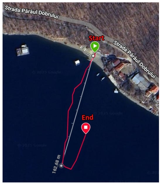 After minute 3:30, an increase in detected strokes was observed, corresponding to the user performing more fluent and consistent paddle strokes following a turnaround maneuver. As shown in Figure 7, upon reaching a distance of 162 m from the starting point, the user executed a turn, after which the strokes became more regular. The smartwatch activity tracking application was manually stopped at the location marked by the red pin. The smartwatch recorded a total of 52 strokes.