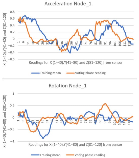 Each slave device acquires data continuously. Minor or insignificant movements are not considered eligible for similarity calculation; in such cases, the similarity score is set to zero. The algorithm differentiates between stationary states and motion. For light or short consecutive movements, the system may not acquire a complete dataset for evaluation. Specifically, each node records 40 sets of values for acceleration (ax, ay, az) and rotation (gx, gy, gz) during an eligible movement. If 10 consecutive readings indicate motion, the system acquires an additional 30 sets of values and subsequently evaluates the movement based on the full dataset. At the end of this process, a similarity percentage is generated. Motion detection is defined as variations exceeding 0.5 in either the accelerometer or gyroscope readings. Since the measurement range spans an interval of [−2; 2], corresponding to a total amplitude of 4 units, a deviation of 0.5 represents 12.5% of the full range. Movements surpassing this threshold are considered sufficiently significant to be evaluated by the system.