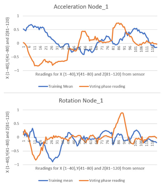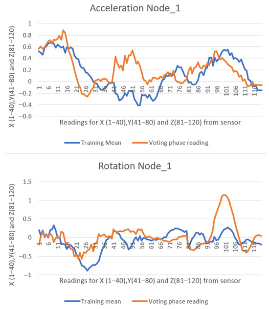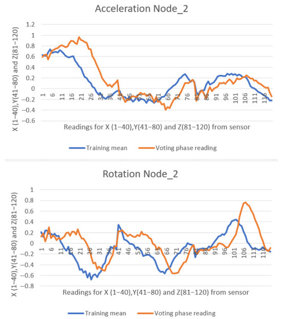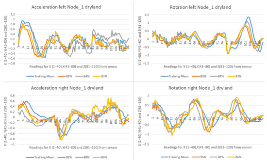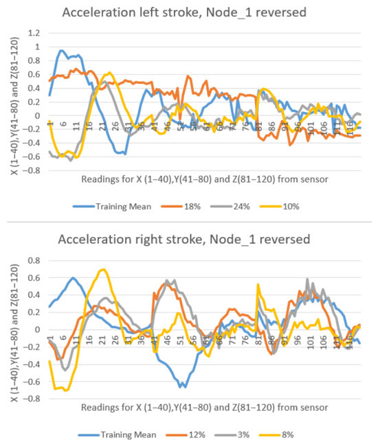 In case of a repositioning on the board, or moving the paddle from one hand to another, there was a significant increase in deviation, resulting in a similarity percentage of 0–20%. Some similarity calculations were lost when moving the paddle from one side to the other, whereby the user waited briefly to allow the system to engage autocalibration. Figure 19 presents data from Node 1, showing the detection of a left stroke with 9% similarity to the trained pattern. This was due to moving the paddle from the left hand to the right hand.
