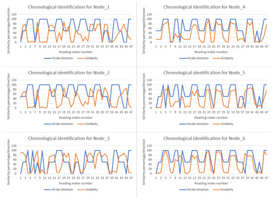 Stroke direction and similarity percentage across all nodes in consecutive readings.