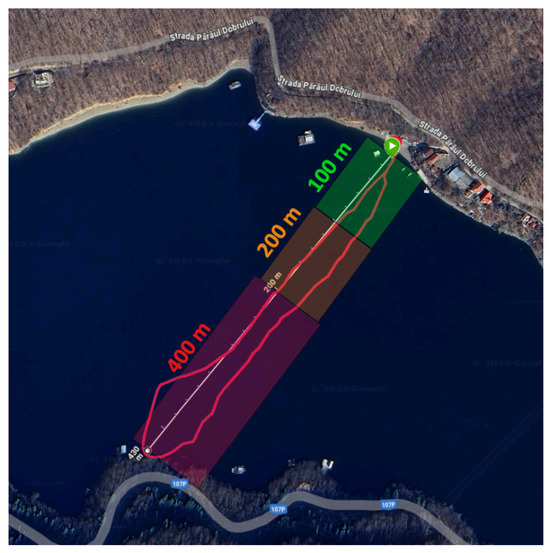 A third experiment was made in order to evaluate how far the slave nodes still transmit to the master node using the ESP-NOW Wi-Fi communication protocol. Subject B was on the paddle board, while Subject A was on the lakeshore for monitorization. It should be noted that in this experiment, the subjects switched places. Based on the first and third experiment, in Figure 17, the areas where the system transmitted better and worse can be observed.