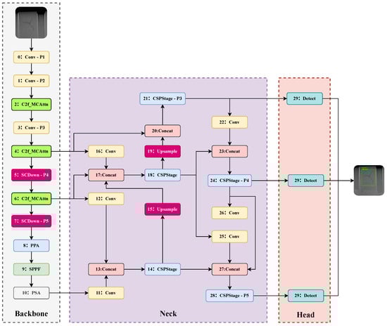 - Backbone Network: At the backbone network level, the MCAttn mechanism is incorporated into the core C2f feature extraction modules, replacing the original C2f modules at the 2nd, 4th, and 6th layers, and PPA is used to replace the C2f module at the 8th layer. This aims to enhance the network’s ability to extract and perceive critical defect features.