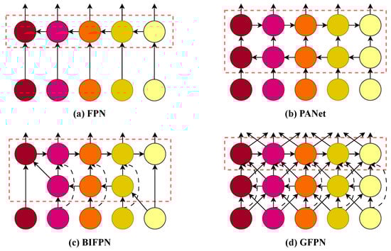 In object detection, effectively fusing features from different backbone levels is crucial for identifying targets across various scales. Over the years, several feature pyramid network architectures have been proposed to address this challenge, with their evolution illustrated in Figure 4. The classic Feature Pyramid Network (FPN) [] (Figure 4a) established a top-down pathway to merge high-level semantic features with low-level spatial details. Subsequently, the Path Aggregation Network (PANet) [] (Figure 4b) introduced an additional bottom-up pathway, creating a more effective bidirectional information flow. More advanced structures like BiFPN [] (Figure 4c) and GFPN [] (Figure 4d) further optimized the fusion process.