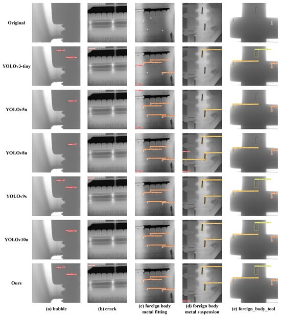 In addition to the quantitative performance metrics evaluated above, to more intuitively compare the performance differences of various models in actual detection scenarios, we selected typical GIS X-ray image samples covering all five defect categories and conducted a visual analysis of their detection results. Figure 6 shows a comparison of the specific detection outputs of our proposed model (Ours) against the baseline YOLOv10n and four other advanced lightweight detectors (YOLOv3-tiny, YOLOv5n, YOLOv8n, YOLOv9s) on these samples.