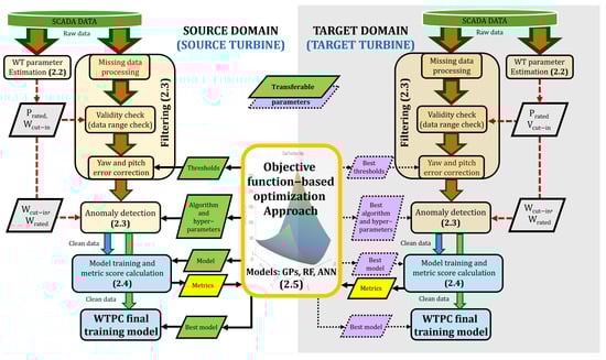 In the target domain, the stages mirror those in the source domain: estimation of WT parameters, filtering to address missing values and correct data errors, application of anomaly detection algorithms, and model training. A key advantage, however, is the use of previously optimized parameters from the source domain. This prior knowledge allows the optimization process to converge more rapidly, as the starting point is already near optimal. These values can be directly applied to enable effective anomaly detection on the target wind turbine’s SCADA data. To further improve predictive performance, a refinement step using Bayesian optimization [38] is applied. This approach ensures that the new turbine achieves high accuracy in both anomaly detection and performance prediction, without requiring extensive retraining, thereby making the process efficient and scalable across different turbines and sites.