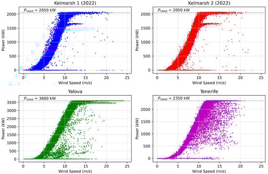 Regarding the estimation of wind turbine characteristic parameters, Table 6 combines the real (manufacturer) values, when available, and the estimated values for the cut-in and rated wind speed and the rated power for each dataset. Wind speed estimations are considered comparable to manufacturer values when the absolute difference is less than 0.5 m/s, since the proposed method discretizes wind speed into bins in accordance with the IEC standard [50]. Rated power estimations are regarded as comparable when the relative difference is less than 1% of the manufacturer’s value [51], given that the proposed method defines as the 99th percentile of the power. Larger deviations are interpreted as case-specific and attributable to the site conditions discussed in Section 2.2.