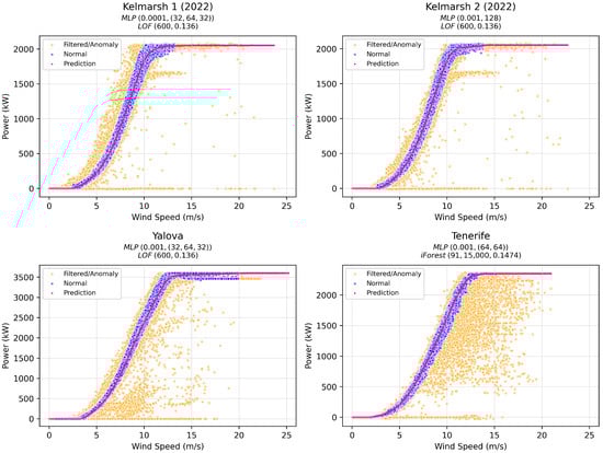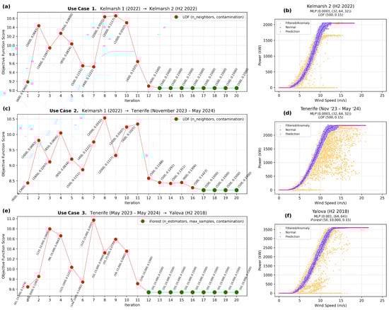 - The methodology automatically estimates optimal hyperparameters for various filtering and anomaly detection strategies, including Isolation Forest (iForest), Local Outlier Factor (LOF) [35], and DBSCAN. This is performed by minimizing a multi-metric objective function that balances the predictive accuracy of models such as GPs, Random Forests (RFs), and ANNs trained on nominal data; the proportion of instances retained after preprocessing; and the resulting variability in the power range.