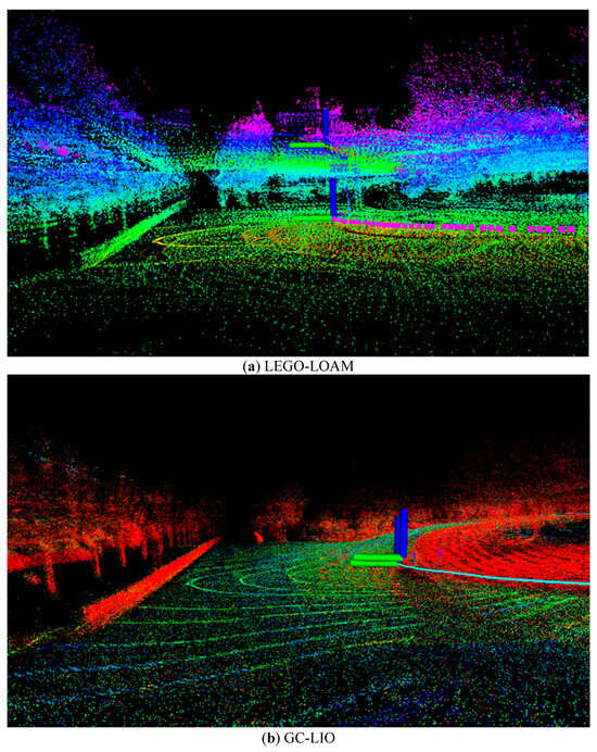 - In addition, it should be noted that hardware selection has a non-negligible influence on the experimental results. The LiDAR sensors used in this work have relatively sparse vertical resolution, which directly affects the strength of vertical geometric constraints and may limit performance in certain environments. While our proposed ground constraint mitigates this weakness, sensors with denser vertical channels could further improve accuracy. Moreover, the IMU precision and synchronization quality also contribute to the overall stability of the system. Regarding field tests, the evaluation scenarios—although representative—mainly feature structured environments with sufficient planar regions. More diverse and unstructured field conditions should be considered in the future to comprehensively assess robustness and generalization.