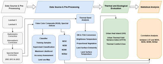 The Land Surface Temperature (LST), Urban Thermal Field Variance Index (UTFVI), and key spectral indices were calculated in this study using satellite imagery from the United States Geological Survey (USGS), specifically Landsat 5, Landsat 8, and Landsat 9 for the years 2003, 2013, and 2023. These satellite datasets were chosen to provide high temporal resolution and consistent multi-decadal observations of environmental and thermal dynamics within the study area.