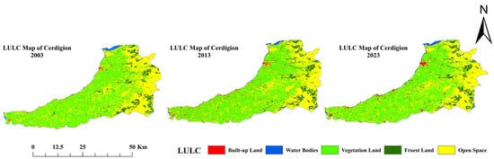 Analysis of land use and land cover (LULC) data from 2003, 2013, and 2023 revealed significant changes in landscape patterns in Ceredigion County. Urban areas expanded notably from about 20 km2 in 2003 to 105 km2 in 2023, largely at the expense of agricultural and forested land. This trend mirrors broader urbanization observed elsewhere, where built-up areas increasingly encroach on natural landscapes [1,2]. However, our study uniquely focuses on a predominantly rural Welsh county, offering new insights into land cover change in less urbanized regions.